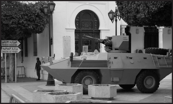 An armoured car stands guard in front of the Ministry building in Tunisia