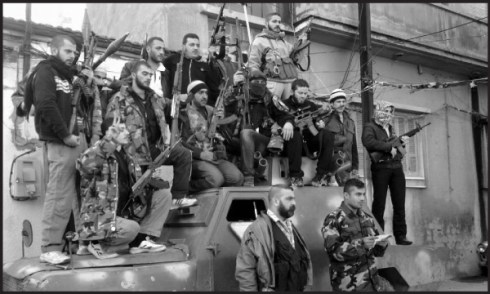 Free Syrian Army members posing on top of a captured army vehicle