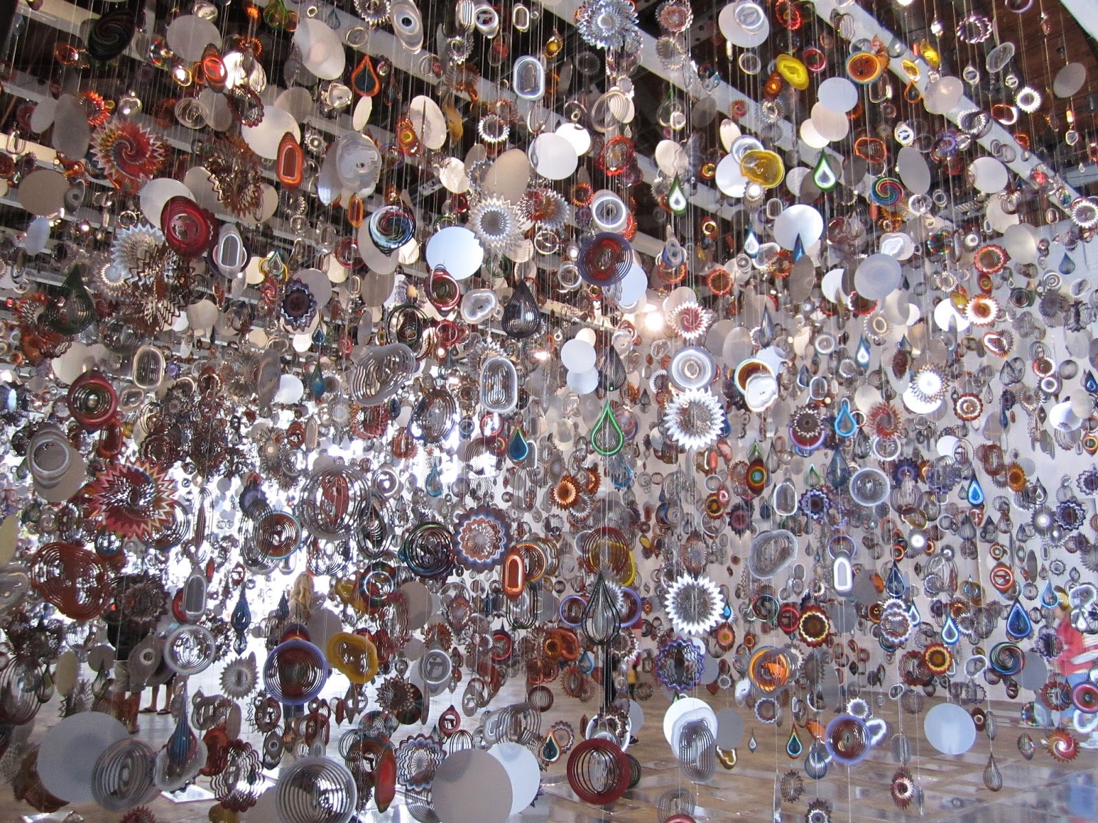 Upon entering the exhibition, the viewer is immersed in Cave’s vision. Hanging from the ceiling, hundreds of objects shimmer and move, a vast spectacle that surrounds the Tramway space. Through colour, rhythm, and movement Cave has created a sense of joy and celebration. Cave disrupts this revelry by placing symbols of violence (guns, teardrops, and targets) amongst these playful objects, a stark and important reminder of the interlinked issues of gun violence and racism that are rife in America.